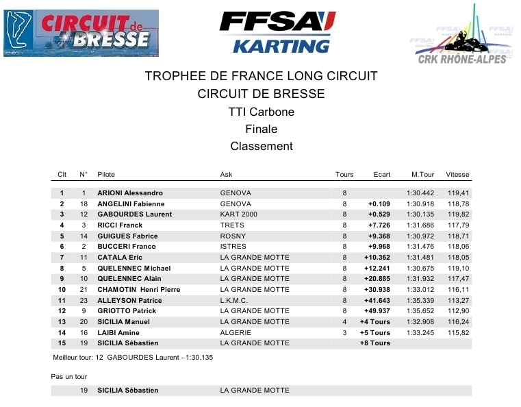1ER ARIONI ALESSANDRO - I 2EME ANGELINI FABIENNE - I 3EME GABOURDES LAURENT - I 4EME RICCI FRANCK - F 5EME GUIGUES FABRICE - F 6EME BUCCERI FRANCO - F FINALE
