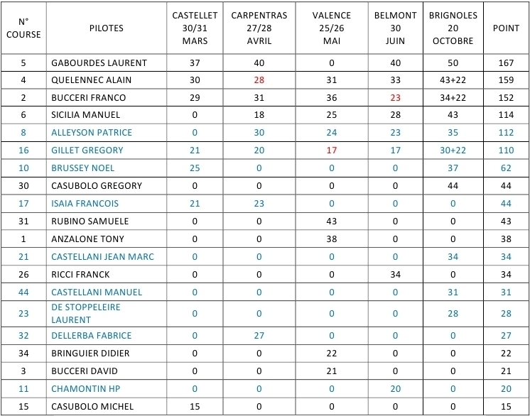 MASTER EN BLEU - ELITE EN NOIR 12 POINTS DE PARTICIPATION A CHAQUE EPREUVE - POINTS DE PARTICIPATION X 2 A LA DERNIERE EPREUVE bonus de 20 points pour participation aux 5 épreuves LE PLUS MAUVAIS RESULTAT SUR LES 5 EPREUVES N'EST PAS COMPTABILISE |