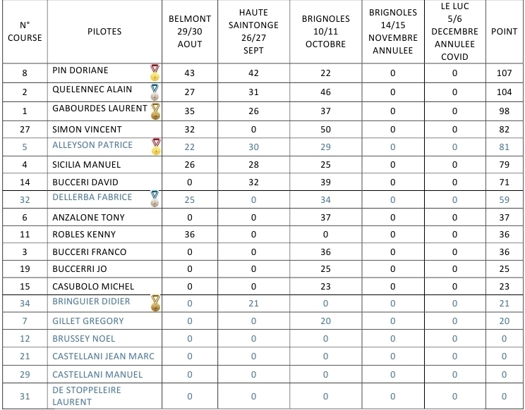 TROPHEE FRANCE TTI CARBONE 2020 CLASSEMENT CHAMPIONNAT SUR 5 EPREUVES Victoire amplement méritée pour ses pilotes malgré cette saison en demi-teinte, cause Covid, auquel organisateurs et concurrents ont dû faire face et s'adapter tout au long des championnats 2020. La féminine Doriane PIN remporte avec brio le titre du TROPHEE FRANCE TTI 2020 devant 2 concurrents de taille Alain QUELENNEC 2ème et Laurent GABOURDES qui clôture ce beau podium. Côté Master, Patrice Alleyson remporte brillament la victoire devant un Fabrice Dellerba redoutable et stratégique ou il faudra compté sur lui en 2021 pour aller à la chasse de la victoire. On retrouve Bringuier Didier qui se hisse à la 3ème marche du podium. |